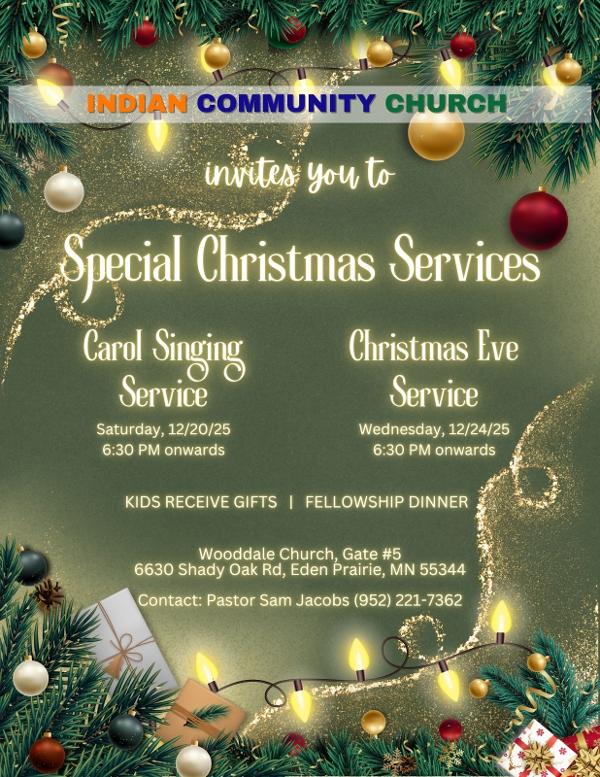? ?* Indian Community Church Carol Singing Service Multi- Lingual Kids receive gifts Delicious dinner Pastor Sam G Jacobs