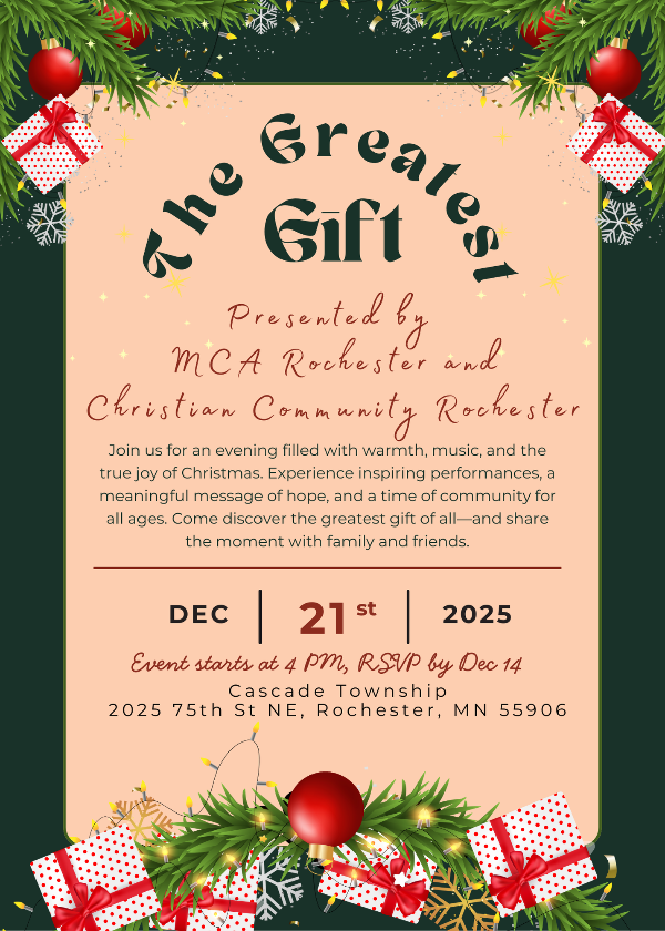 Join us for an evening filled with warmth, music, and the true joy of Christmas. Experience inspiring performances, a meaningful message of hope, and a time of community for all ages. Come discover the greatest gift of all--and share the moment with family and friends.