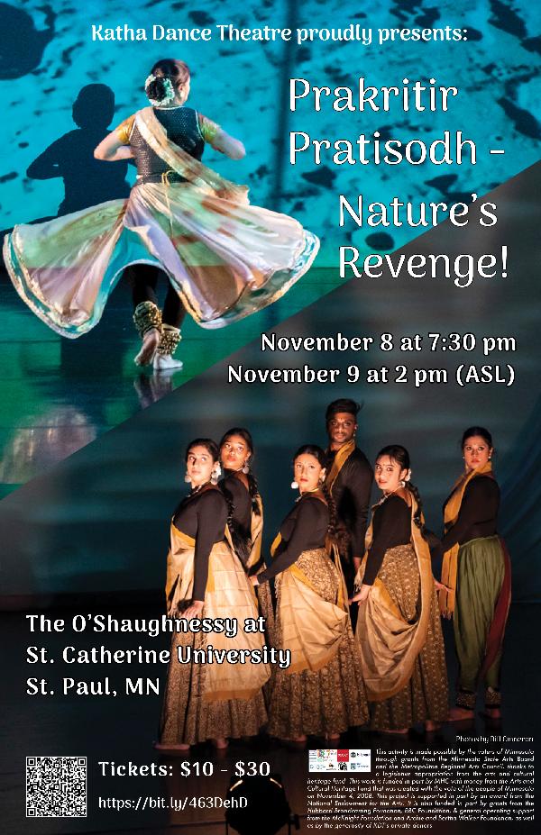 Katha Dance Theatre (KDT) is excited to bring the local premiere of Prakritir Pratisodh - Nature's Revenge! to the O'Shaughnessy at St. Catherine University on November 8 - 9, 2025. This performance marks the Minnesota debut of the evening-length show, which expands upon the original concept that took the stage as a work-in-progress at the Cowles Center's Fall Forward Festival in 2023.