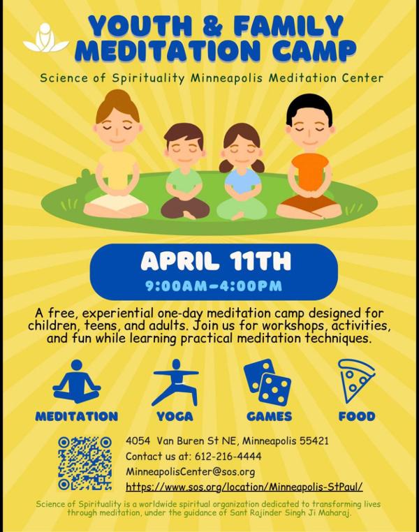 Dear All, Discover Inner Peace Together! Join our Youth & Family Spiritual Meditation Camp designed for children, parents, and adults alike. Through fun concentration exercises, interactive games, and engaging demos, learn meditation techniques that boost focus, reduce stress, and promote a healthier, balanced life. With tailored sessions for young children, teens, and adults, everyone can find their zone--whether you're a family or an individual seeking mindfulness. Don't miss this unique opportunity to grow, bond, and thrive!