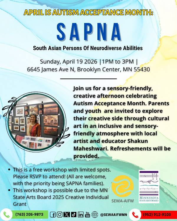 Join us for a sensory-friendly, creative afternoon celebrating Autism Acceptance Month. Parents and youth are invited to explore their creative side through cultural art in an inclusive and sensory-friendly atmosphere with local artist and educator Shakun Maheshwari. Refreshments will be provided.