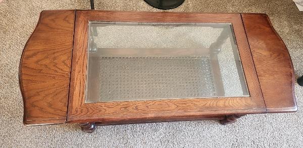 Rectangular wooden with glass top and extended leaflet at both end. Good condition for an immediate move out sale.
