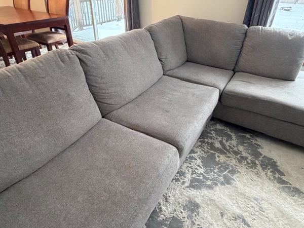 Spacious gray sectional couch in great condition. Very comfortable and perfect for living rooms, family rooms, or basements. Neutral gray color matches easily with any décor. Condition: ? Very good condition ? Clean, no tears, light stain ? Smoke-free and pet-free home Details: Sectional sofa (L-shaped) Color: Gray Seats multiple people comfortably Sturdy frame and supportive cushions