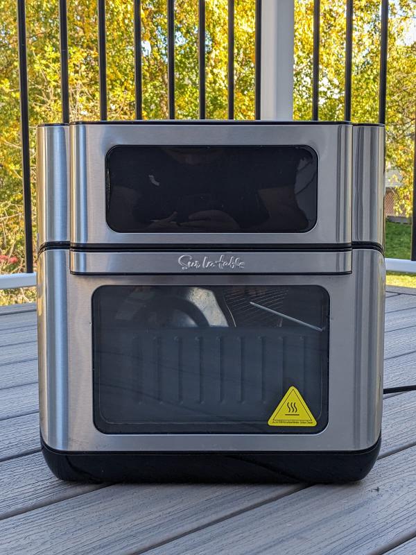 Sur La Table multifunctional air fryer - can be used in many ways. Includes accessory set - Rotisserie pieces, kabob sticks, basket, drip pan, tray, with original recipe book.