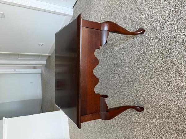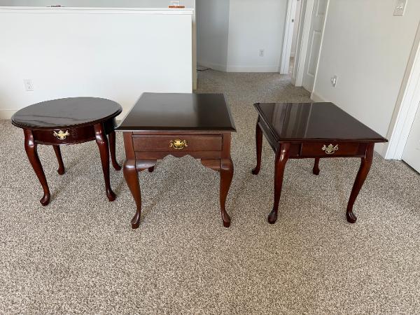 Beautiful solid wood side tables. Has a rich, dark finish. Each table has a drawer with a decorative brass pull. This set includes one square, one rectangular, and one round table. All have classic cabriole legs. Selling each for $50