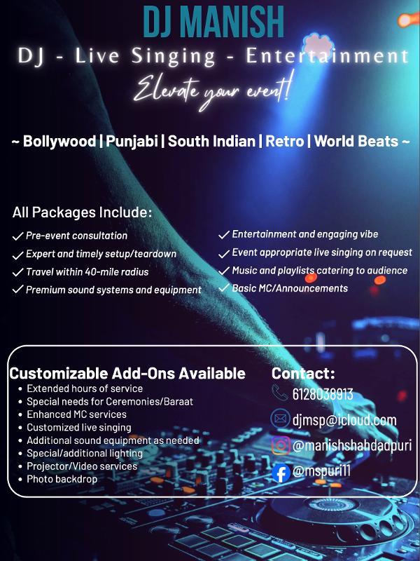 - Community and Cultural Events/Parties (Holi, Diwali, New Years and more..)